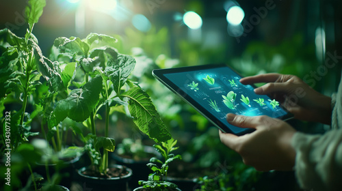 Close-up of a gardener using a tablet to control irrigation and monitor plant growth. Modern smart gardening combines technology with agriculture for precision and efficiency.