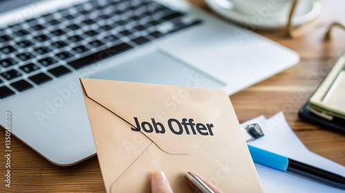 Close-up of a glowing envelope with a "Job Offer" stamp on a clean desk, symbolizing career opportunity and new beginnings in professional life.