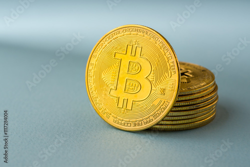 Close-up of a golden shiny Bitcoin BTC Cryptocurrency Coin on a blue background