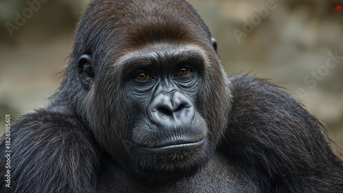 gorilla, primate, mammal, face, facial features, expression, closeup, wildlife, nature, wild animal, jungle, powerful, majestic, detailed, realistic, fur, eye, nose, mouth, intense, contemplative, biological, portrait, expressive, no people