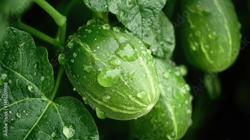 green, cucumber, growing, plant, round, fats, wrinkled, texture, covered, droplet, water, indicating, leaf, dark, glossy, background, blurred, focal, photo