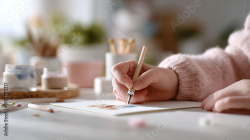 Closeup of a hand painting with watercolors on paper. Serene, creative hobby. Illustrates artistry, mindful creation, and artistic passion. Ideal for blogs, ads.