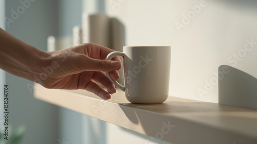 Close-up of a hand reaching for a white ceramic mug on a minimalist wooden shelf in soft natural light.