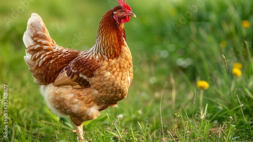 Closeup of a healthy chicken pecking at bugs and foraging in an open field emblematic of the high animal welfare standards upheld on sustainable livestock farms. .