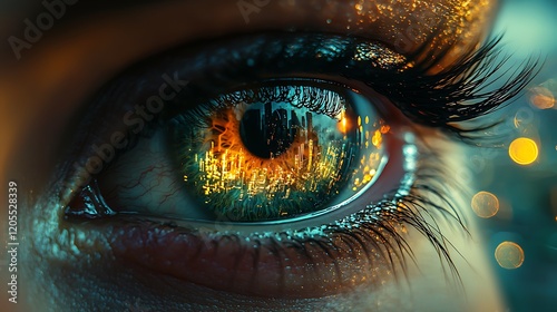 close-up of a human eye reflecting a dystopian landscape. Hyper-realistic detail, subtle tear, introspective mood. Surreal, cinematic focus, intense.