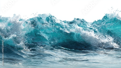 Close-up of a large ocean wave, turquoise, breaking towards a clean white background