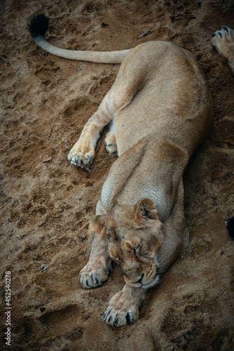 Close-up of a lioness lying down to sleep