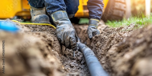 Close-up of a male worker installing a pipe in a trench at a construction site.