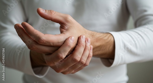 hand, wrist, pain, discomfort, injury, ache, health care, medicals, health, disease, man, male, adult, person, human, body part, closeup, detail, skin, finger, nail, touch, feeling, suffering, symptom, problem, treatment, therapy, doctor, hospital, care, well-being, wellness, stress, tension, anxiety, pressure, massage, rehabilitation, recovery, anatomy, bod, caucasian, white, shirt, clothing, lifestyle