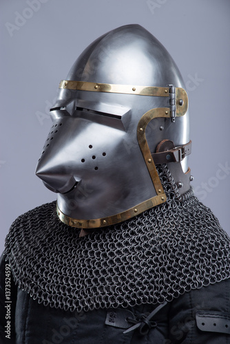Close-Up of a Medieval Bascinet Helmet with Hounskull Visor