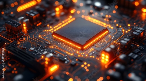 Close-up of a microchip featuring luminous circuits and electronic components, created in 3D to capture the technological innovation and power generation of modern chips.