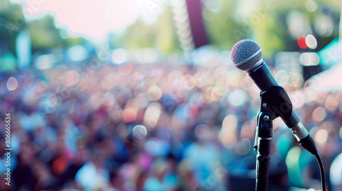 Closeup of a microphone and blurry background of a large crowd of a concert audience or political speech
