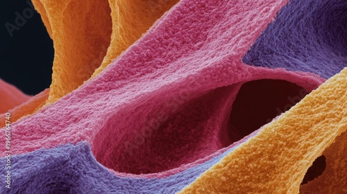 microscopic, view, tissue, sample, multiple, layer, layer, pink, middle, orange, purple, arranged, way, pattern, overlapping, colours, vibrant, texture, rough, bumpy, perspective