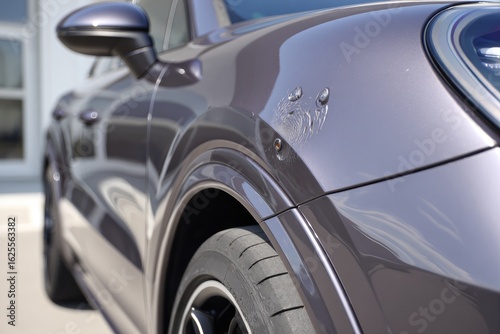 suv, car, fender, damage, grey, vehicle, modern, closeup, detail, exterior, metal, paint, wheel, tire, repair, dent, imperfection, body, side, profile, luxury, high-end, automotive, detailing, gloss, shine, light, shadow, curvy, sport, compact, sedan, rim, black, protection, blemish, imprint, surface, automobile, metallic