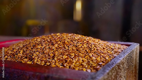Close-up of a mound of golden brown seeds on a rustic wooden surface in a warm, dimly lit environment