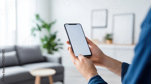 Close-up of a person holding a smartphone with a blank screen in a modern living room setting
