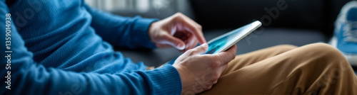 person, tablet, hand, device, digital, technology, screen, blue, sweater, finger, touch, using, holding, scrolling, calm, focused, concentrated, relaxed, comfortable, casual attire, home, interior, modern, cosy, peaceful, serene, tranquil, content, leisure, lifestyle, communication, cyberspace, connection, work, application, online, information, relaxation