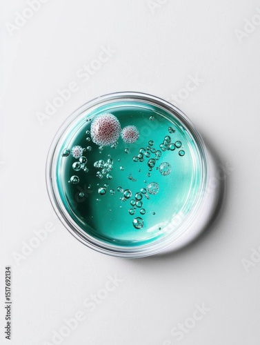Close-up of a petri dish with a greenish-blue liquid inside. the liquid appears to be a type of bacteria or mold, as there are small bubbles floating around the surface of the dish.