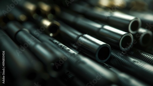 Close-up of a pile of shiny black metal pipes.