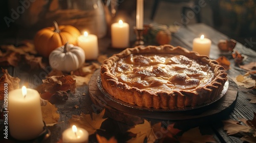Close-up of a pumpkin pie on a rustic table, surrounded by autumn leaves and candles.