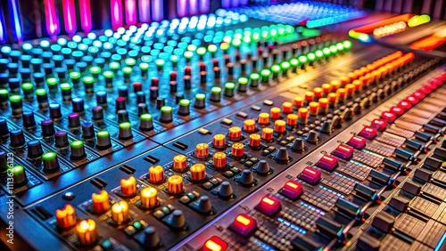 Close-up of a recording studio mixing console with colorful illuminated buttons and faders , Recording, Studio, Mixing console