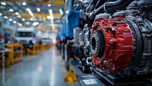 engine, manufacturing, factory, assembly line, vehicle, automotive, industry, production, red, metal, machinery, equipment, technology, engineering, mechanical, industrial, detail, closeup, modern, plant, transportation, gear, chrome, shiny, new, precision, innovation, design, power, heavy, duty, blur, background, indoor, bright, clean, workshop, mechanic, maintenance, repair, service, logistic
