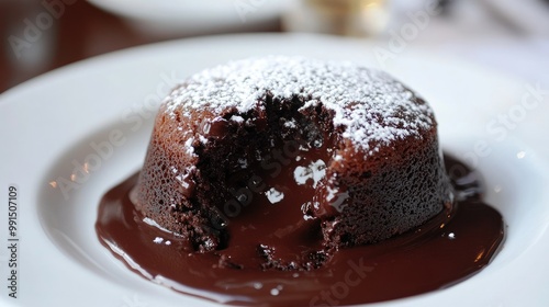 Close-up of a rich chocolate lava cake with a gooey center, served with a dusting of powdered sugar on a white plate.