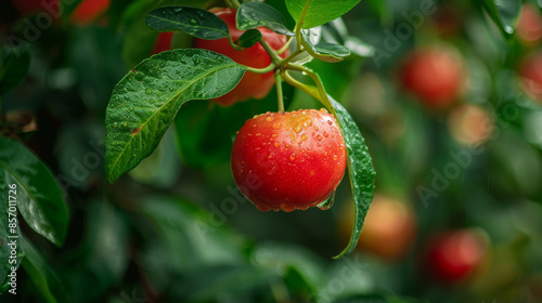 Close-up of a ripe red apple with water droplets hanging from a green leafy branch in a lush orchard.