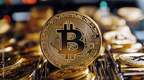 Close-up of a shiny gold Bitcoin surrounded by more coins, symbolizing cryptocurrency investment and digital finance.,Golden Bitcoin Cryptocurrency Coins Closeup