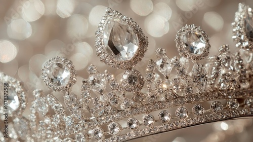 Close-up of a silver tiara encrusted with tiny diamonds, showing sparkling details on a light background.