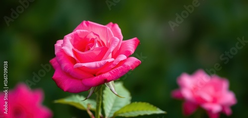 Close-up of a single vibrant pink rose against a blurred green background, isolated, beauty
