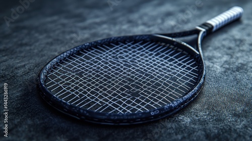 Close-up of a sleek black tennis racket resting on a textured surface.