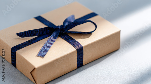 Close-up of a small rectangular gift box wrapped in brown kraft paper with a neatly tied dark blue ribbon bow on a light textured surface