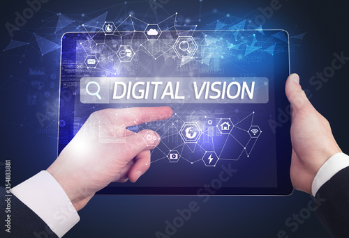 Close-up of a tablet searching DIGITAL VISION inscription, hi-tech computing concept