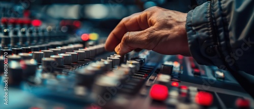 Closeup of a technician s hand operating a control panel, with copy space