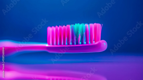 Close-up of a vibrant, multi-color bristled toothbrush glowing with neon illumination, conceptualizing modern oral hygiene for health awareness.