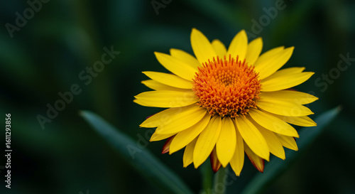 flower, yellow, orange, bloom, blossom, flower petals, flora, floral, plant, botanical, botany, nature, natural, garden, gardening, spring, summer, vibrant, bright, colourful, closeup, macro, detail, beauty, beautiful, single, isolated, background, dark, green, blurred, soft, sharpened, light, sunlight, sun, ray, sunshine, stem, leaf, leaf, growth, growing, outdoors, outside, environment, ecology