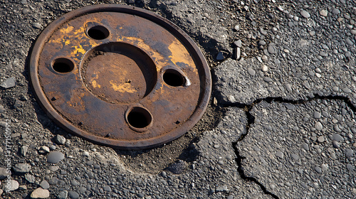 Close-up of a weathered metal cover embedded in cracked asphalt, revealing textures and the effects of time. The cover displays rust, holes, and hints of yellow paint.