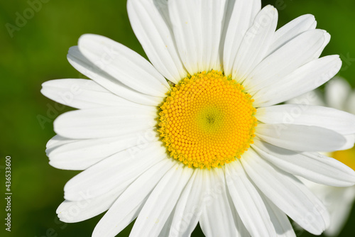 Close-up of a white marguerite with yellow pollen against a green background in spring