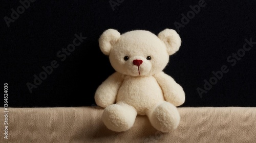white, teddy, bear, sitting, beige, surface, facing, way, viewer, round, head, small, ear, nose, body, soft, fluffy, arm, leg, bent, knee, background, black, racked, taken, angle, highlighting, feature, animal, photo