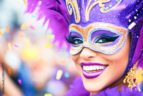 Close-up of a woman wearing a sparkling purple mask adorned with glitter and feathers, radiating carnival joy and energy as confetti fills the background.