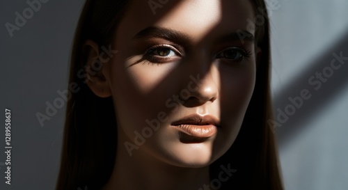 woman, face, shadow, light, close, up, gaze, dramatic, beauty, illumination, pattern, feature, natural, soft, captivating, portrait, expression, skin, aesthetic, photo, model, serene, elegance, artistic, visual, emotion, contrast, calm, profile, make-up, coiffure, feminine, charme, allure, depth, tone, texture, intimate, stylish, chic, modern