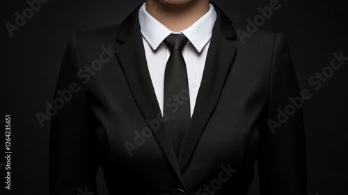 Close-up of a womans black business suit, crisp white shirt, and elegant black tie; professional attire.
