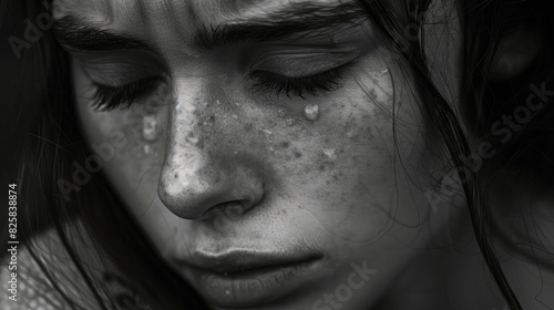 Close-up of a woman's face with eyes closed, tears rolling down her cheeks, overcome with sorrow.