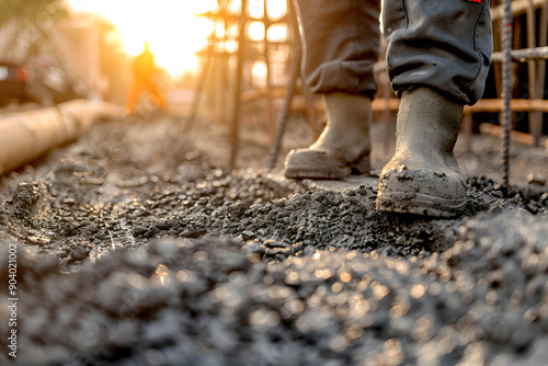 Close-up of a worker inspecting concrete quality at a construction site, investing in infrastructure projects and government support concept