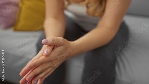 woman, hand, cream, applying, indoor, living, room, skincare, comfort, blond, moisturiser, hygiene, beauty, health, care, cosmetic, routine, product, bodycare, lotion, nourishment, wellness, adult, female, casual attire, house, relaxation, feminine, detail, closeup, texture, home, interior, domestic, daytime, comfortable, young, sitting, furnishing, sofa, cushion, leisure, daily, habit, maintenance, cosiness, natural, simple