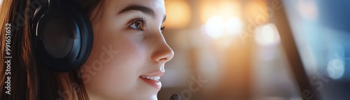 Close-up of a young woman with a headset, smiling and working in a call center environment with soft lighting in the background.