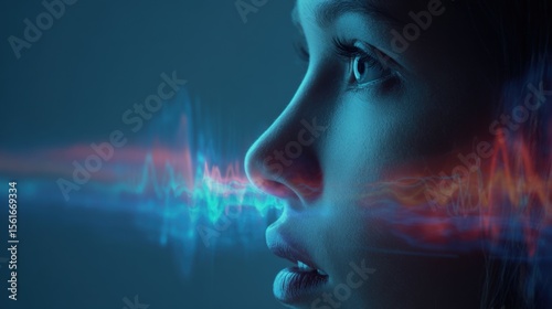 woman, face, profile, digital, wave, technology, science, modern, futuristic, abstract, blue, glowing, illumination, facial features, closeup, expression, mystery, digital artwork, science fiction, innovation, communication, cyber, virtual, connectivity, electronic, neon, glow, human face, high contrast, background, emotional, sharpened, portrait, lifestyle, artistic, creative, health, awareness