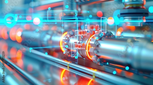 Close-up of advanced industrial machinery in a high-tech factory, featuring glowing components and futuristic digital overlays.