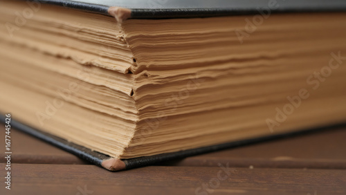 Close-up of aged book with weathered, yellowed pages with black cover